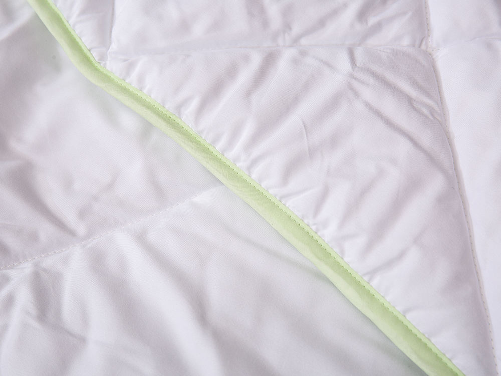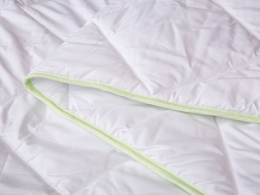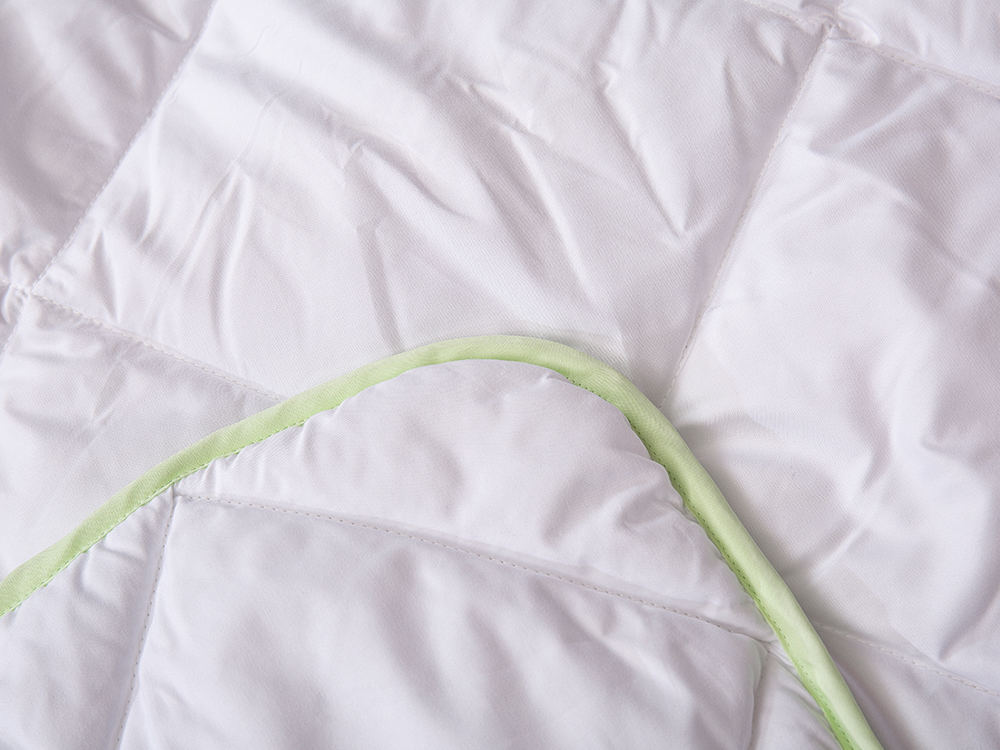 Aloe vera-behandlat borstat tyg är antibakteriellt och anti-mite och är mjukare och hudvänligt. Vitt tyg med ljusgrön aloe vera kantning. Detta är en täcke du inte kan vägra.