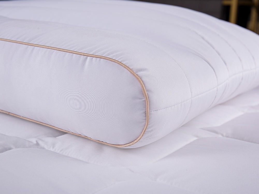 Det klassiska quiltade mönstret med guld satinrör gör denna mångsidiga kudde ännu mer attraktiv. Den nedre sidan av denna kudde är fylld med mjuk fyllning, och den högre sidan är fylld med högläge och högstödfiber. Den låga sidan är för sidor och rygg sömn, bekväm och mjuk. Högsidan har bra stöd, vilket kan hjälpa till att lindra nacksmärta och lindra axelstyvhet.